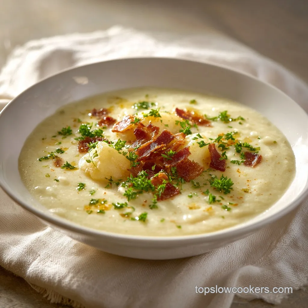 Presentation is where this easy baked potato soup really shines. Think of each bowl as a blank canvas. I love to serve this in wide, shallow bowls so there’s more surface area for toppings. If you're looking for a complete meal, a simple side like my Slow Cooker Tomato Basil Soup provides a nice acidic contrast if you're doing a "soup and salad" or "soup and soup" night for a crowd.