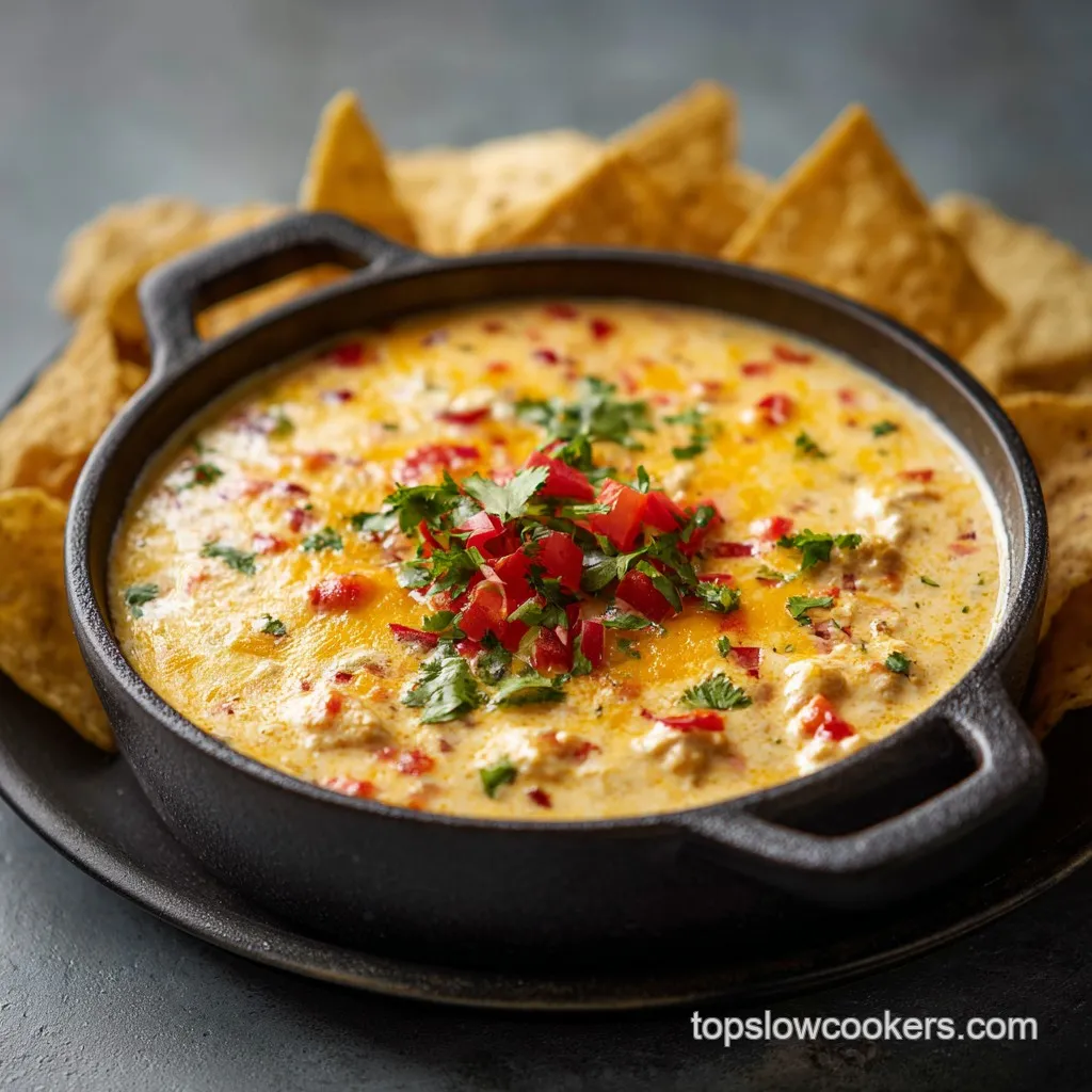 Presentation is about more than just a bowl. Since this is a "Slow Cooker Cheese Dip", the slow cooker itself is often the serving vessel. To make it look more appetizing, wipe the inner rim of the ceramic insert with a damp paper towel before the guests arrive to remove any dried cheese "crust." Top the dip with a handful of fresh chopped cilantro or a few sliced jalapeños for a pop of color against the creamy orange white background.